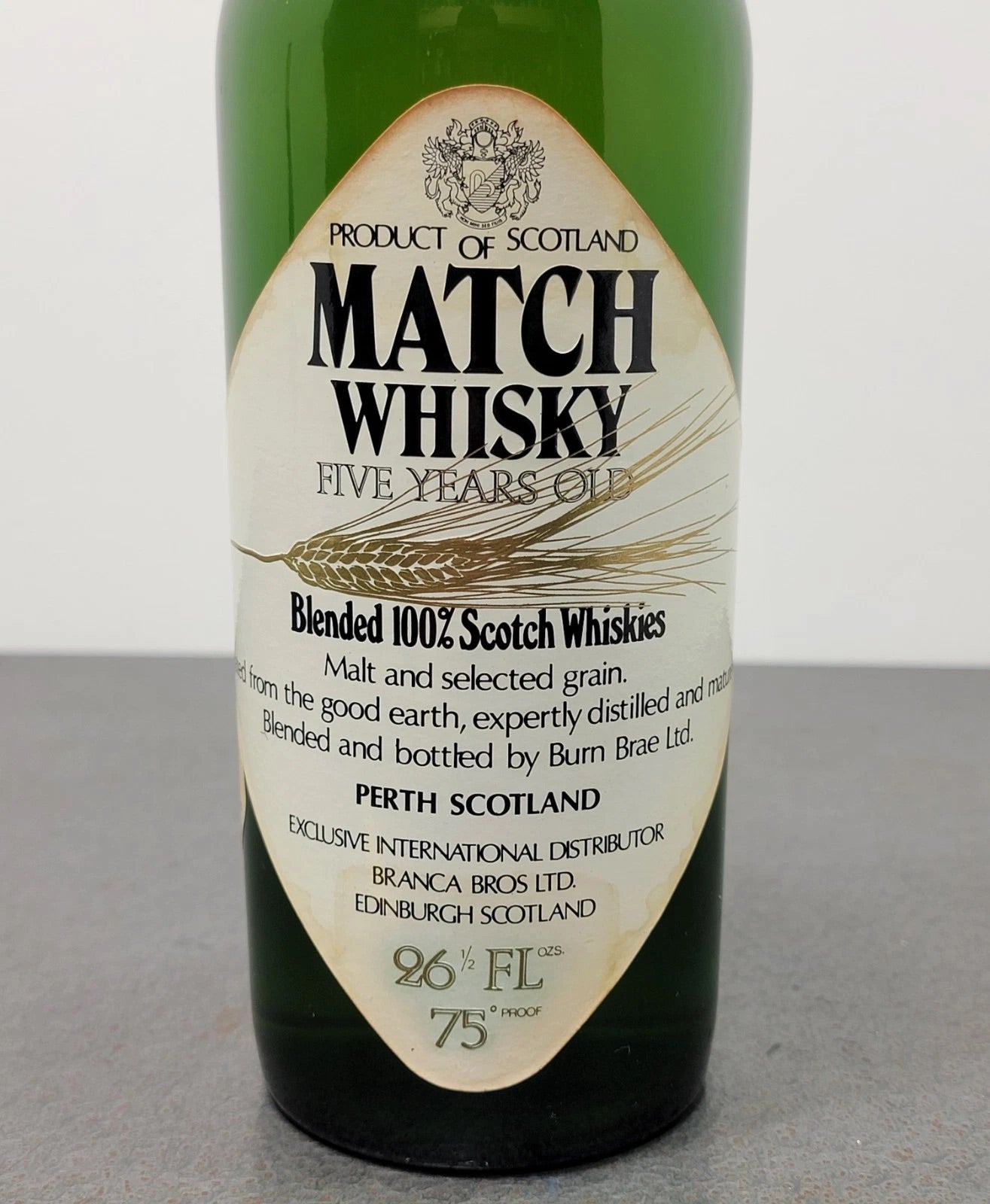 Il Match Whisky Five Years Old è un blended Scotch whisky prodotto e imbottigliato in Scozia da Burn Brae Ltd. e distribuito a livello internazionale attraverso Branca Bros Ltd. Questo tipo di bottiglie rappresenta una testimonianza autentica della produzione scozzese destinata all’esportazione tra gli anni ’60 e ’70, periodo in cui il blended whisky dominava il mercato globale. Oggi questi esemplari sono ricercati soprattutto da collezionisti di whisky d’epoca, memorabilia da bar storici e appassionati di etichette vintage, più per il valore storico e documentale che per il consumo. Una bottiglia che racconta un capitolo meno conosciuto, ma significativo, della storia commerciale del whisky scozzese.